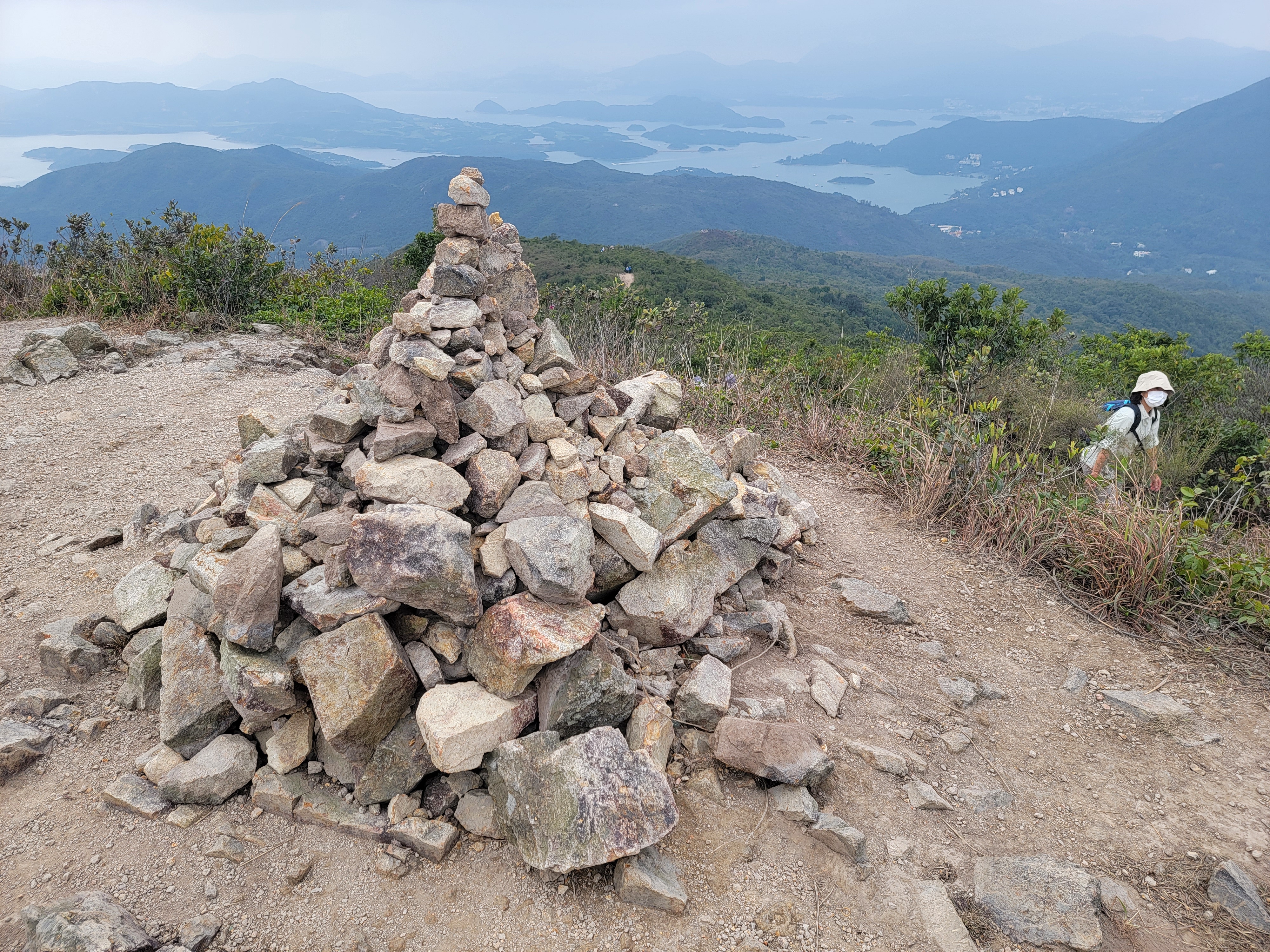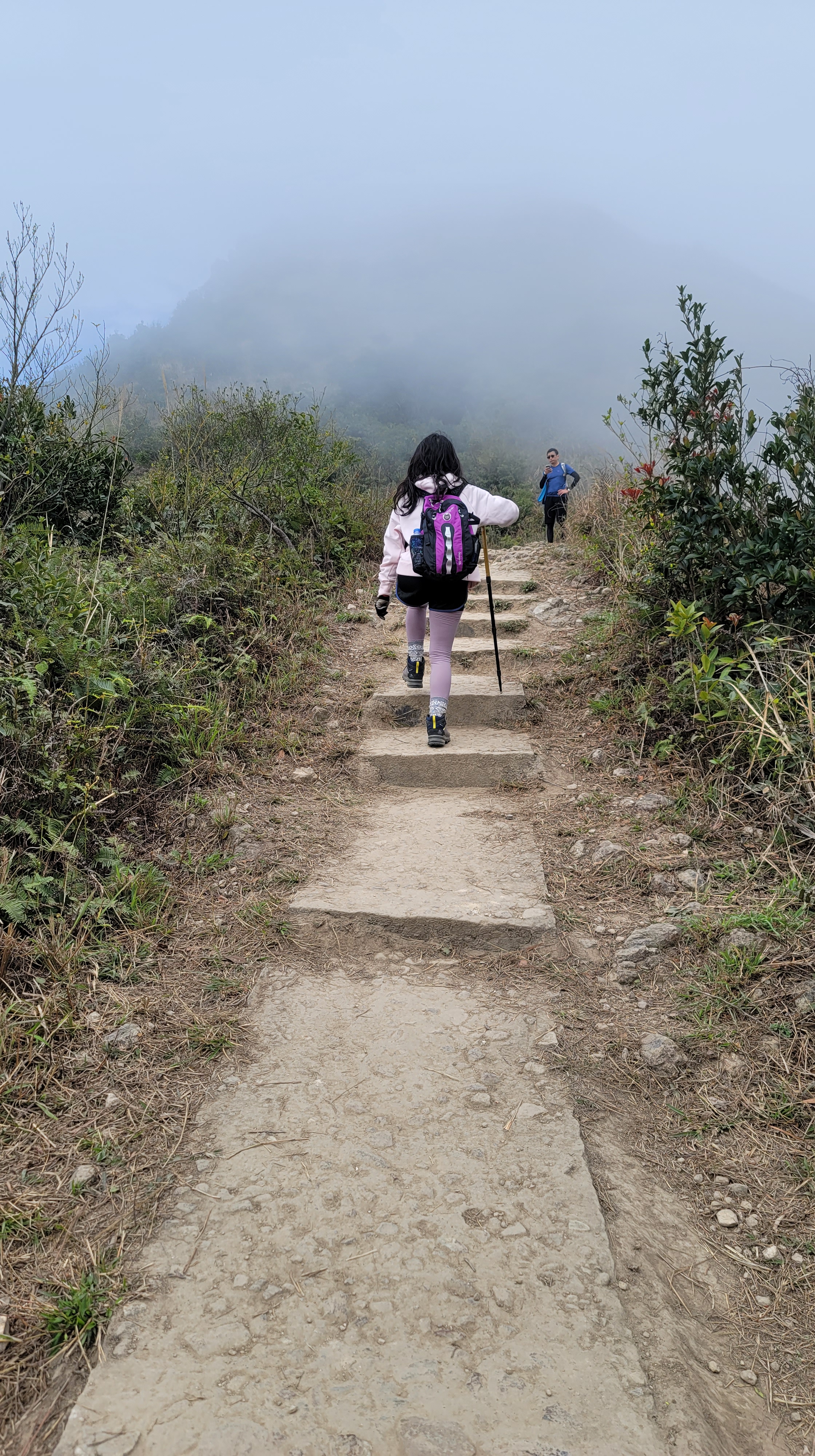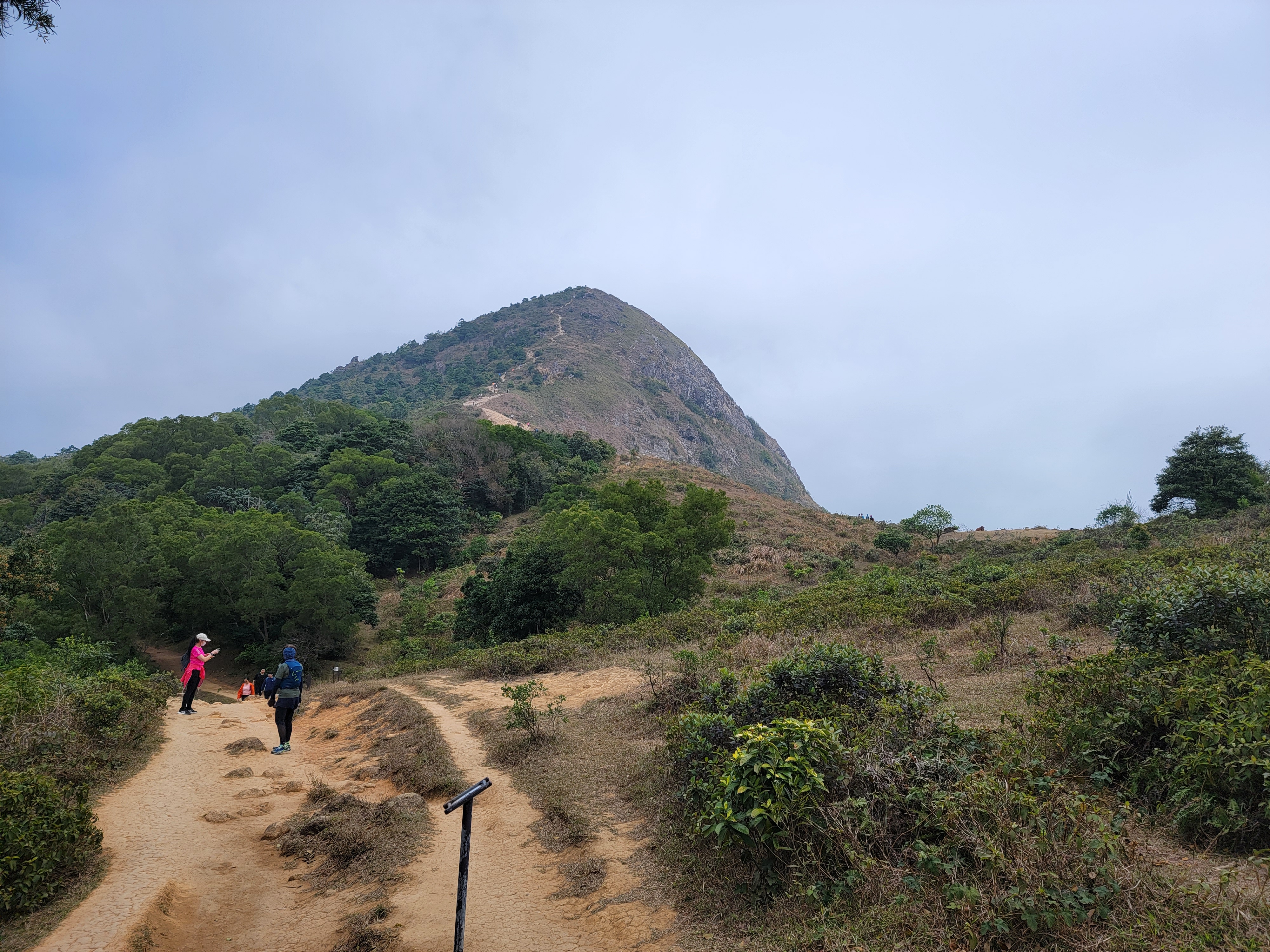 由昂平高原上走至大金鐘的路程雖短 (536M),但山路略為傾斜兼滿佈了浮沙碎石,需手足並用攀登。登峰後視野比昂平更為廣闊,可盡覽西貢外海及馬鞍山景色。可惜今天超大霧,甚麼景色都看不見